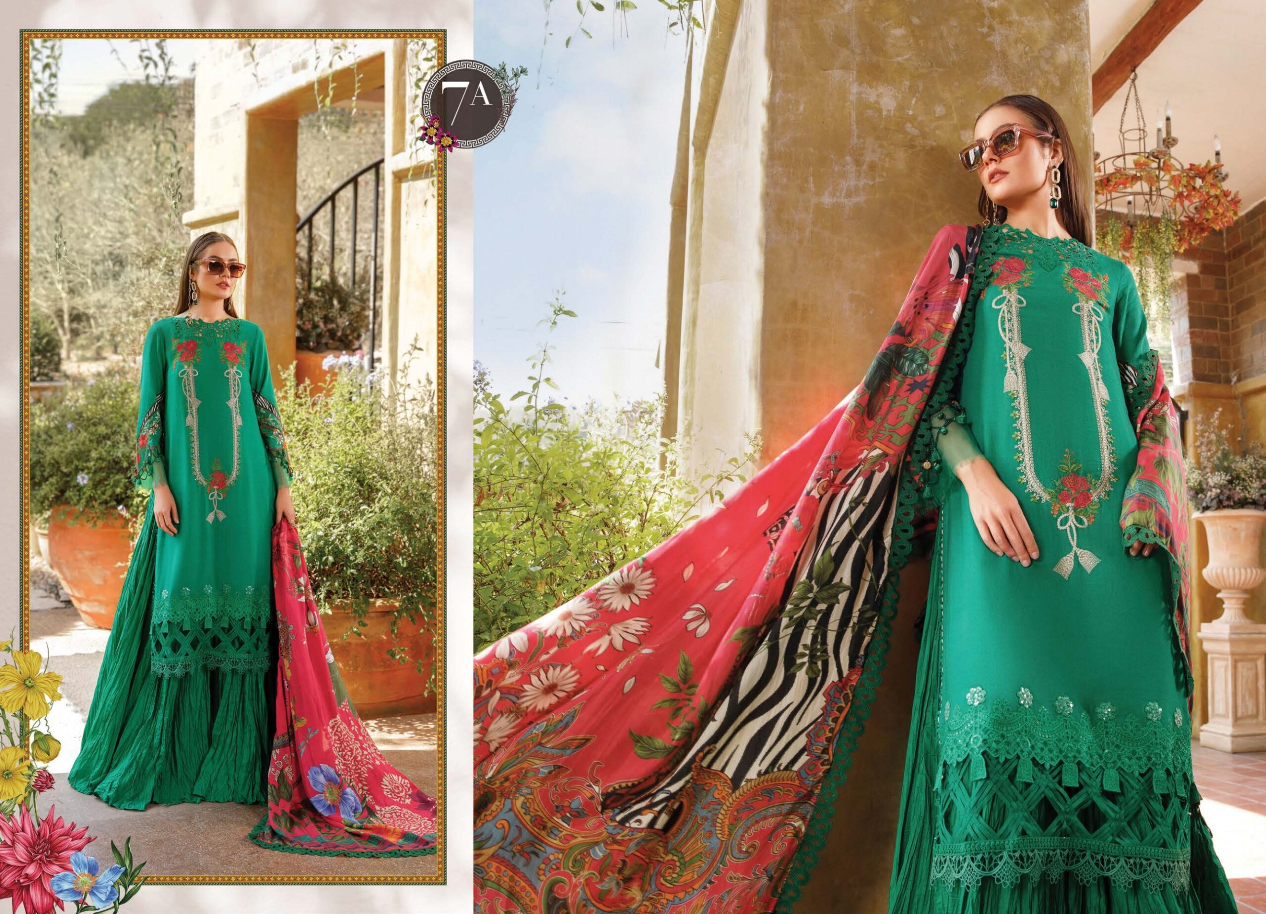 Embroidered lawn front with organza applique Dyed Lawn Back Embroidered Lawn Sleeve Burnout Organza Dupatta Center Dyed Cambric Trouser Embroidered...