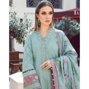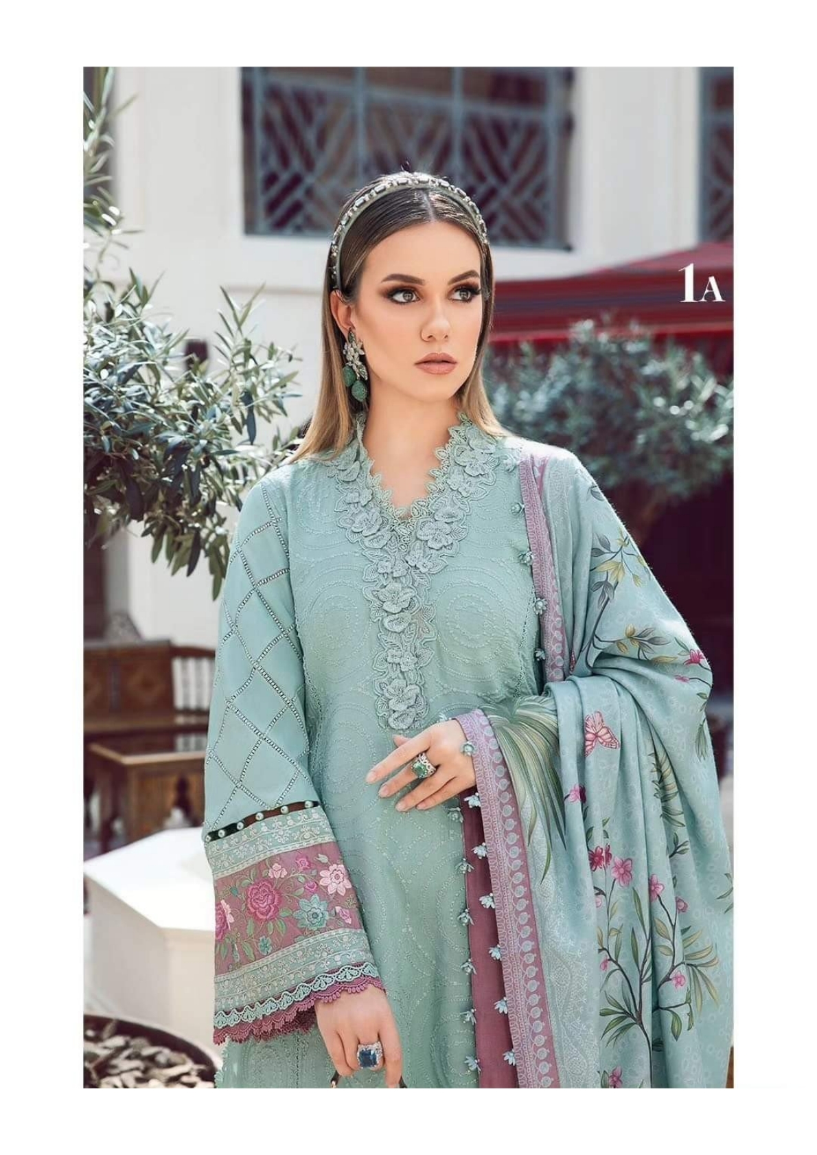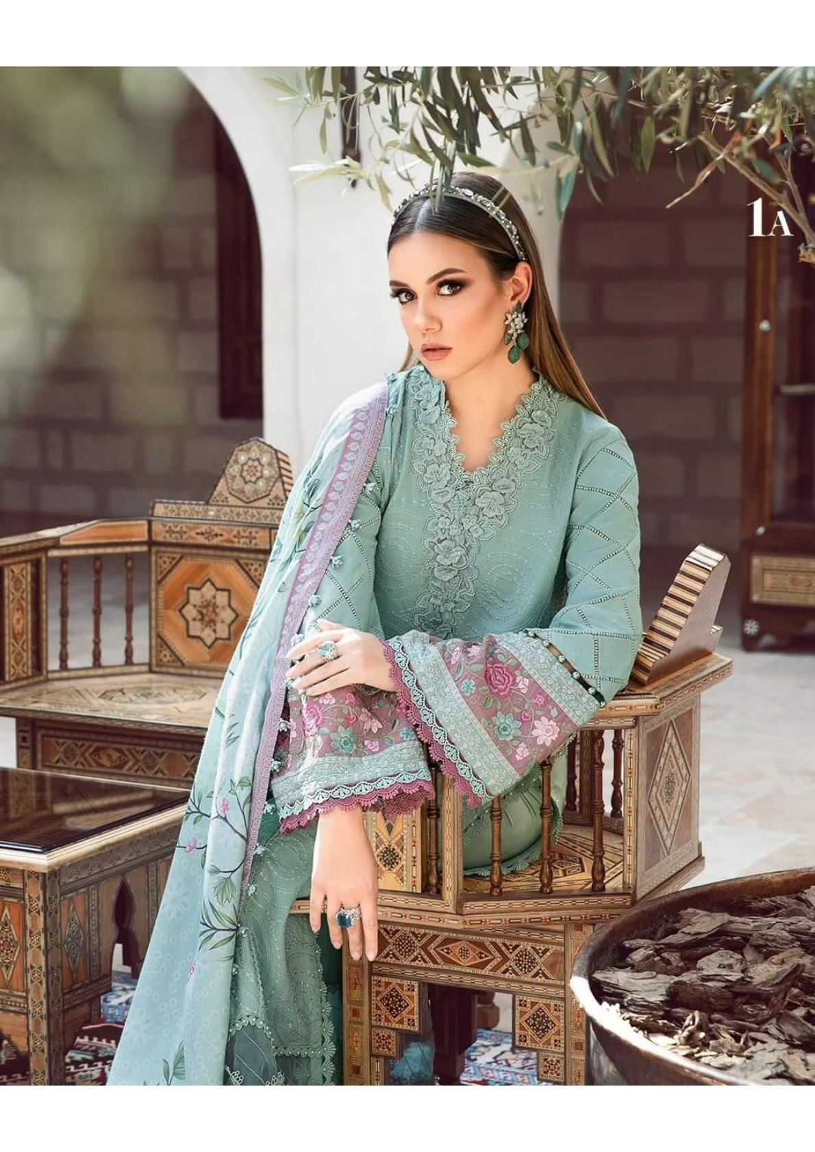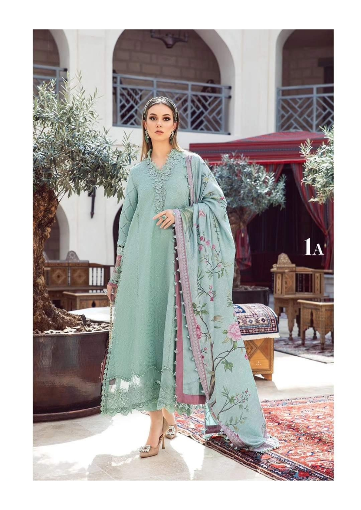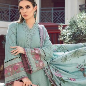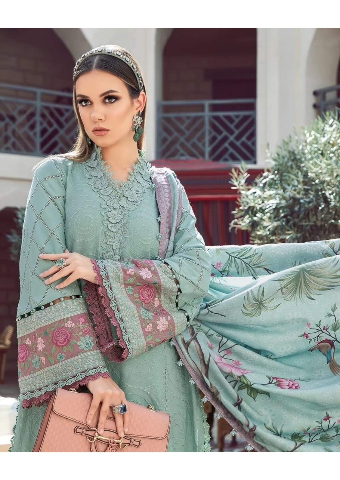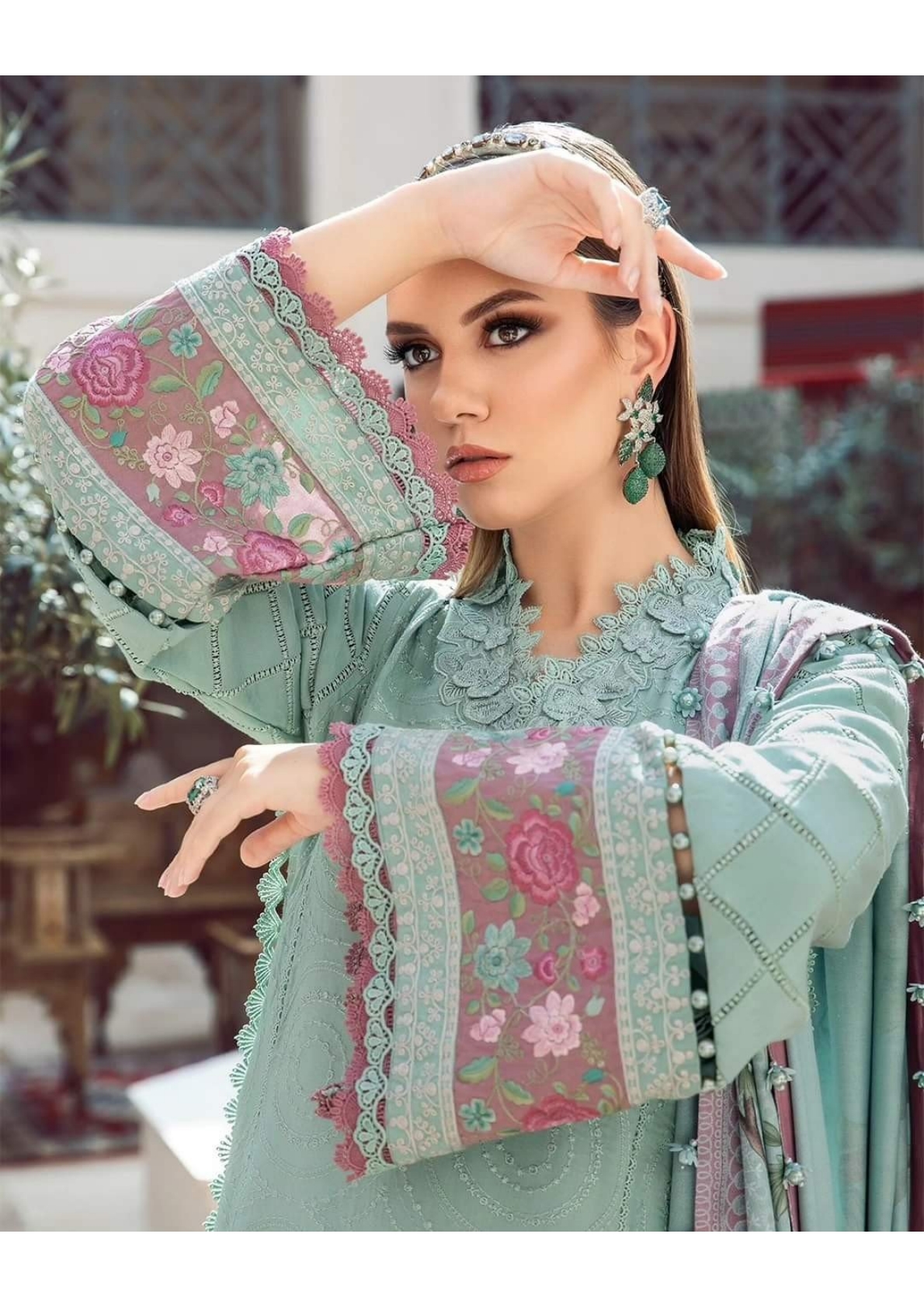 This twill linen ensemble is a testament of grace; illustrated with meticulous embroidery accented with intricate 3D florals in a mesmerizing sea green palette and paired with printed shawl and dyed trousers.