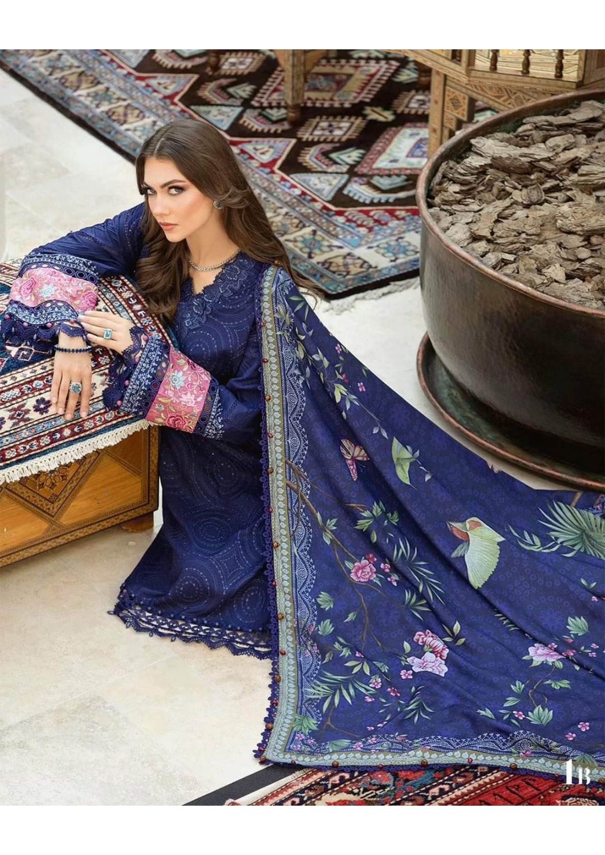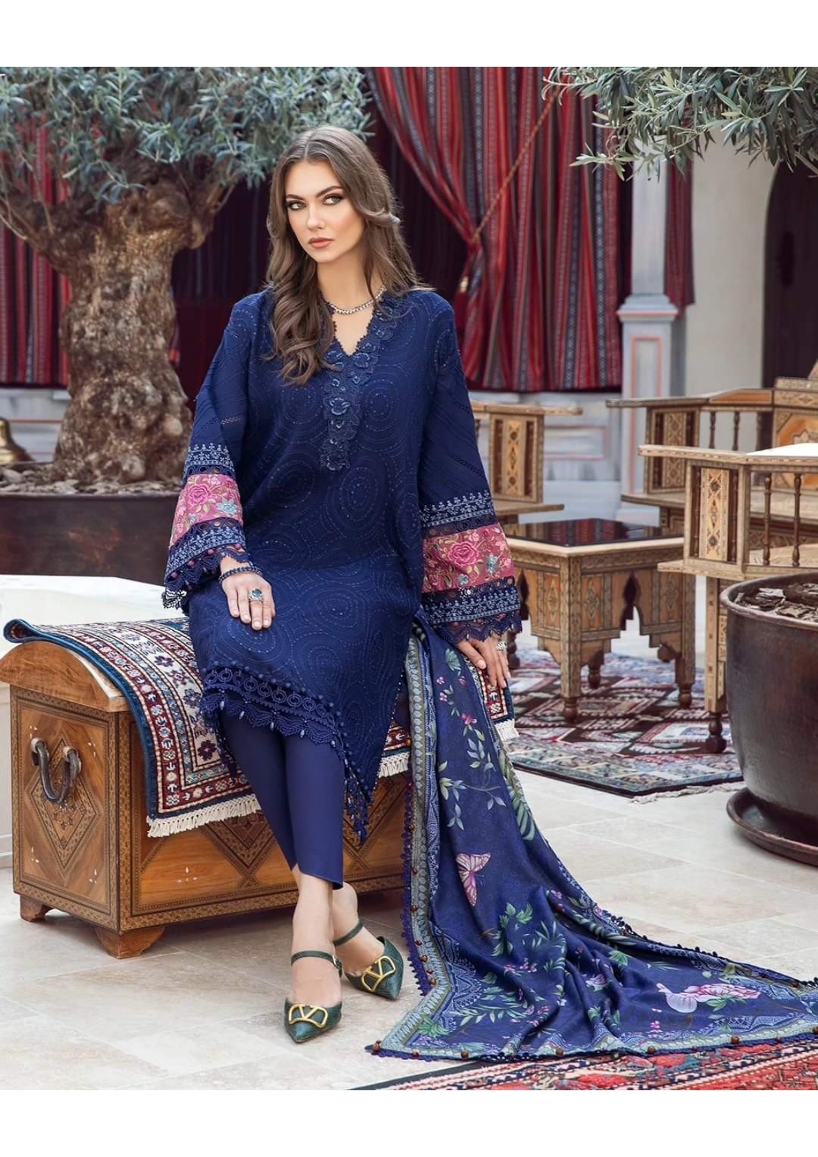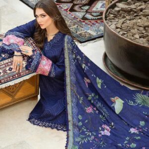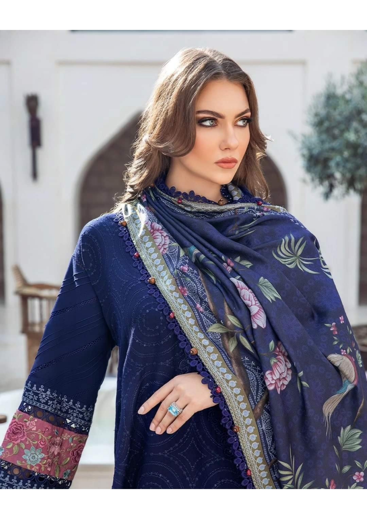 This twill linen ensemble is a testament of grace; illustrated with meticulous embroidery accented with intricate 3D florals in a mesmerizing blue palette and paired with printed shawl and dyed trousers.