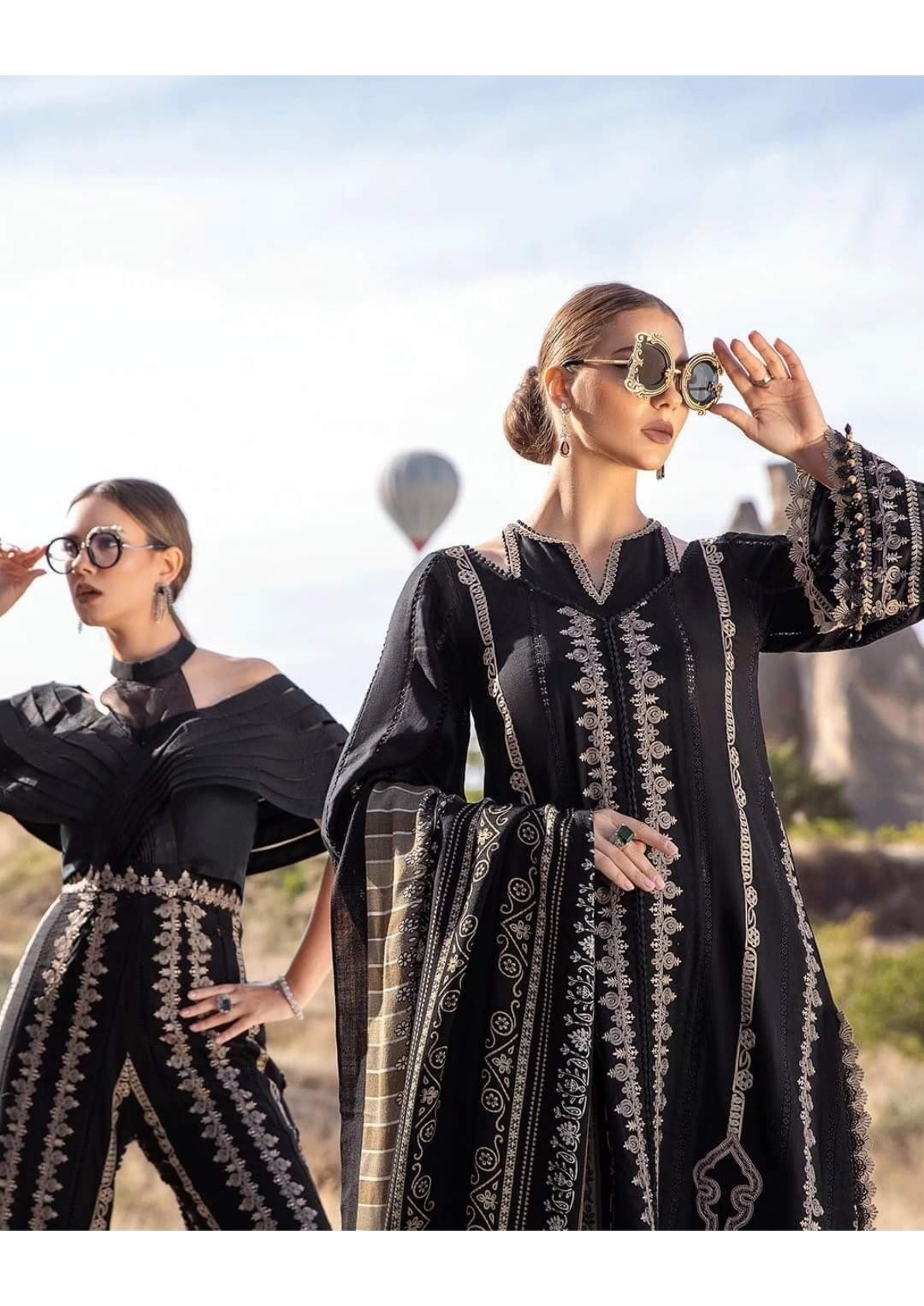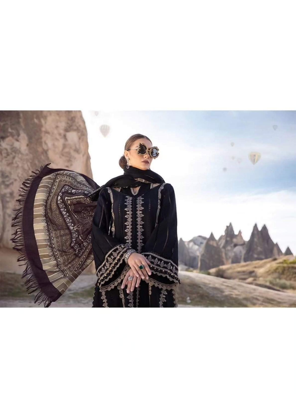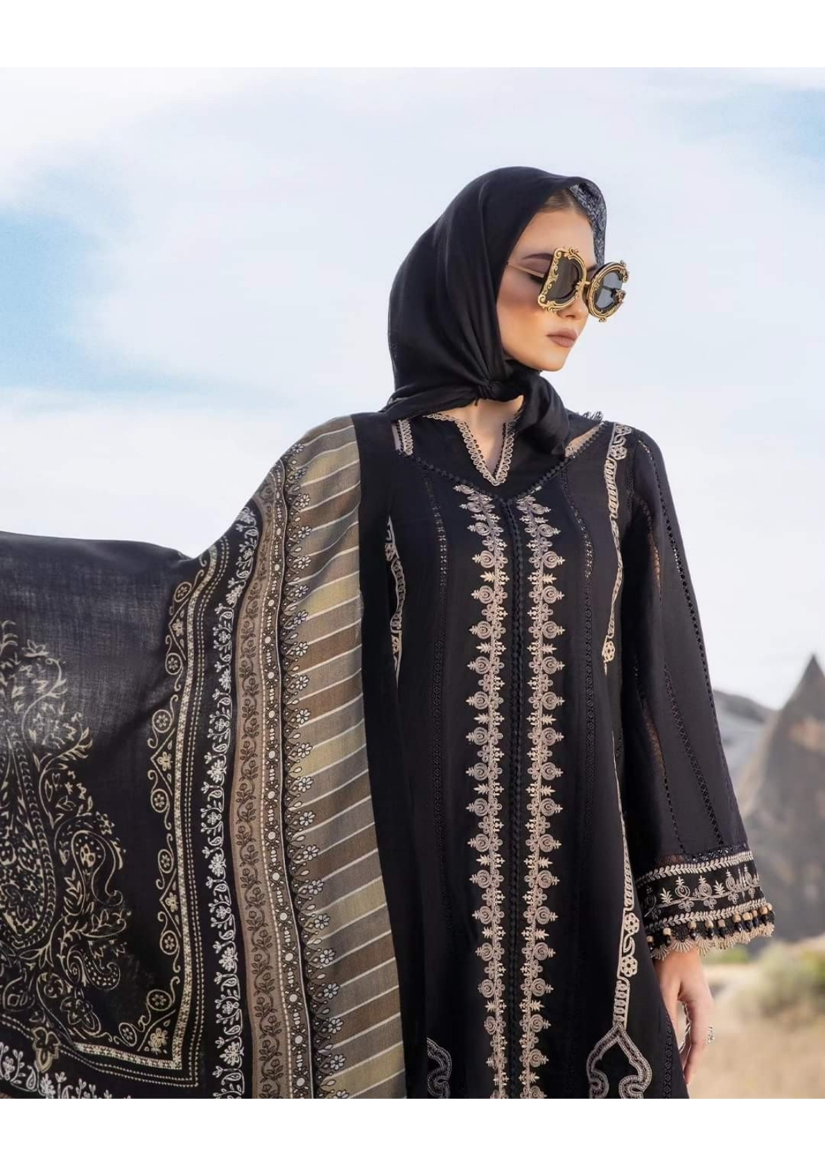 This ensemble is a melange of class and elegance; unveiling effervescent embroidery infused with intricate patches in bold black palette and paired with wool shawl and dyed trousers promising warmth with elegance.