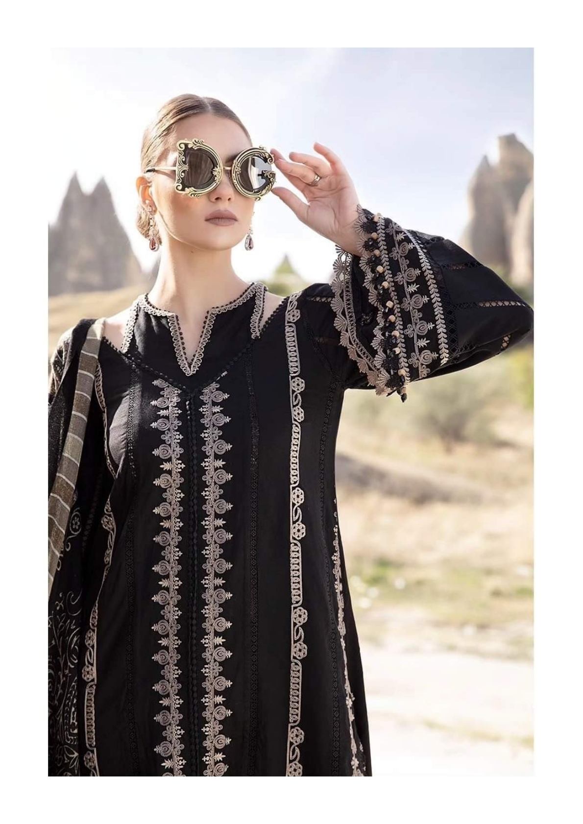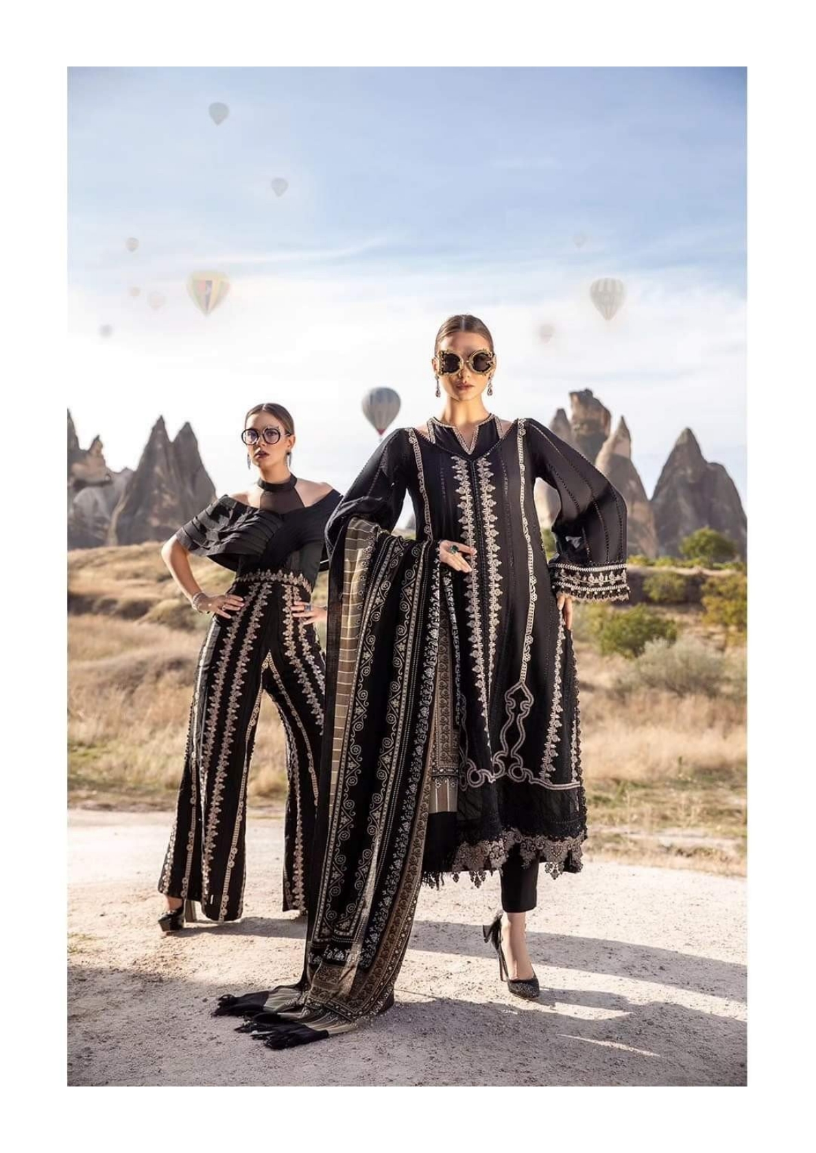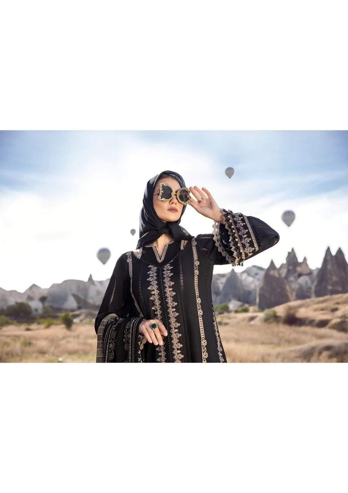 This ensemble is a melange of class and elegance; unveiling effervescent embroidery infused with intricate patches in bold black palette and paired with wool shawl and dyed trousers promising warmth with elegance.