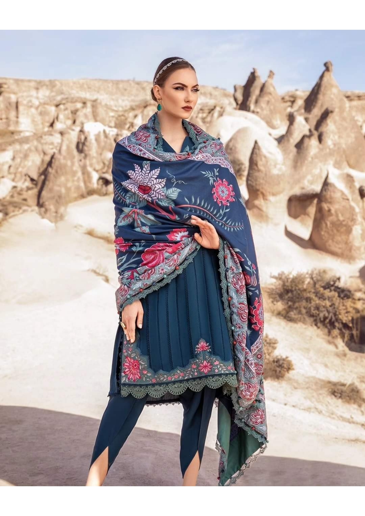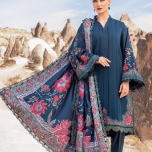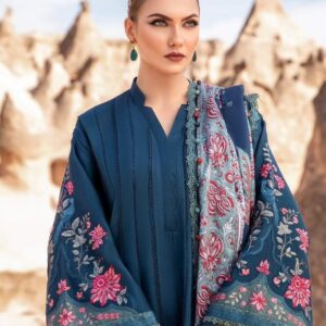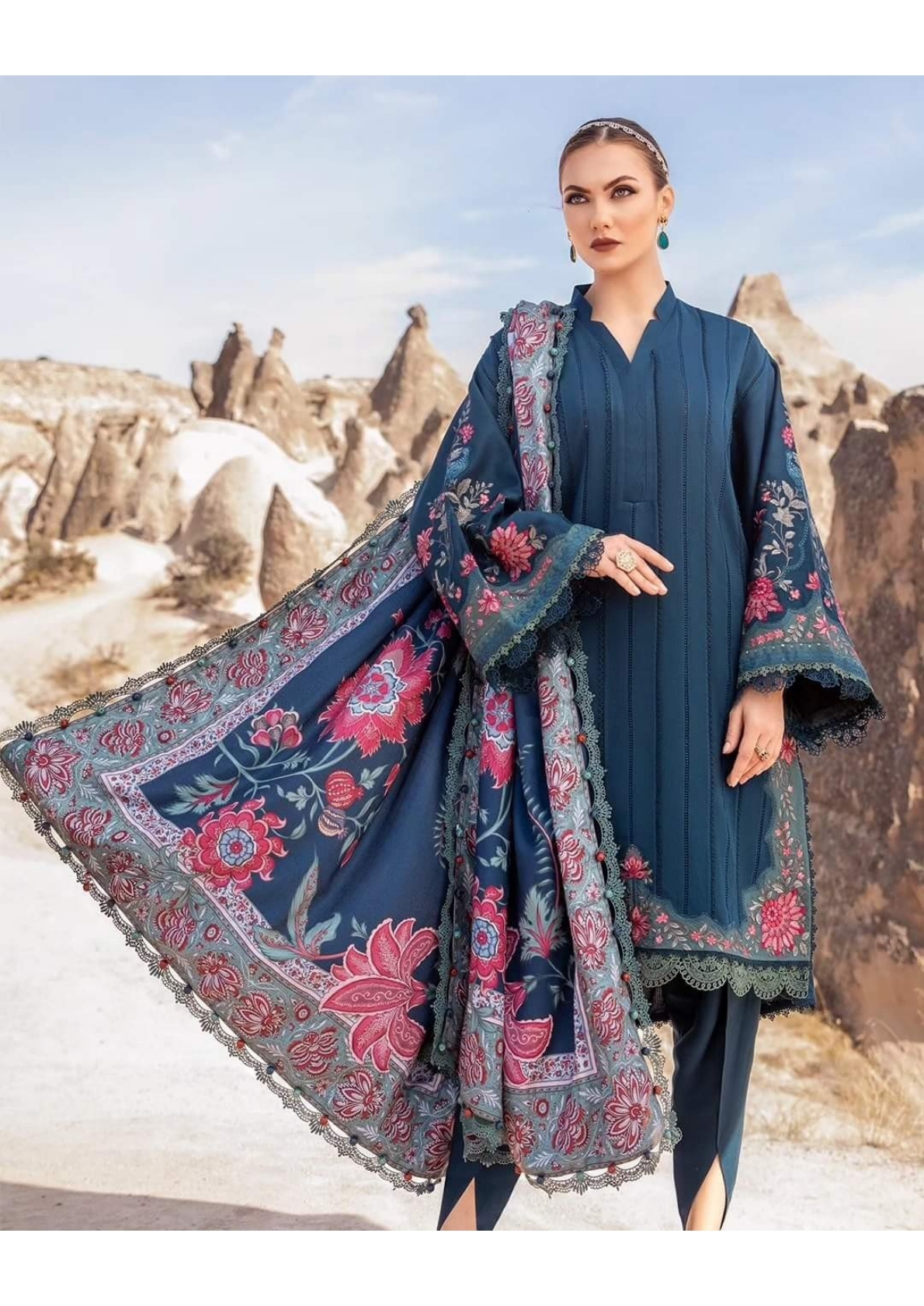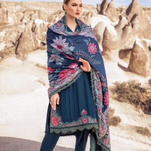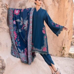 This dress features a mesmerizing blue canvas artfully illustrated with embroidery patti and patches and accompanied by printed shawl and dyed trousers, transporting you to a world of timeless elegance and grace.