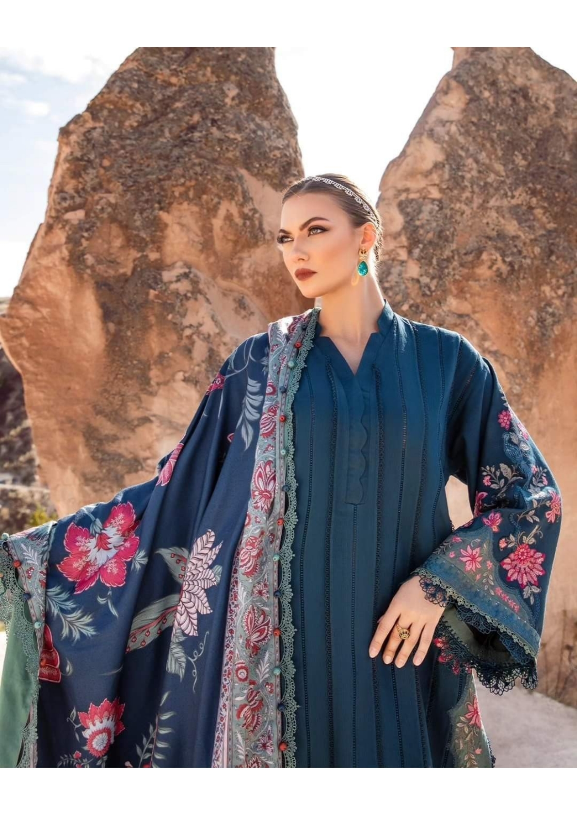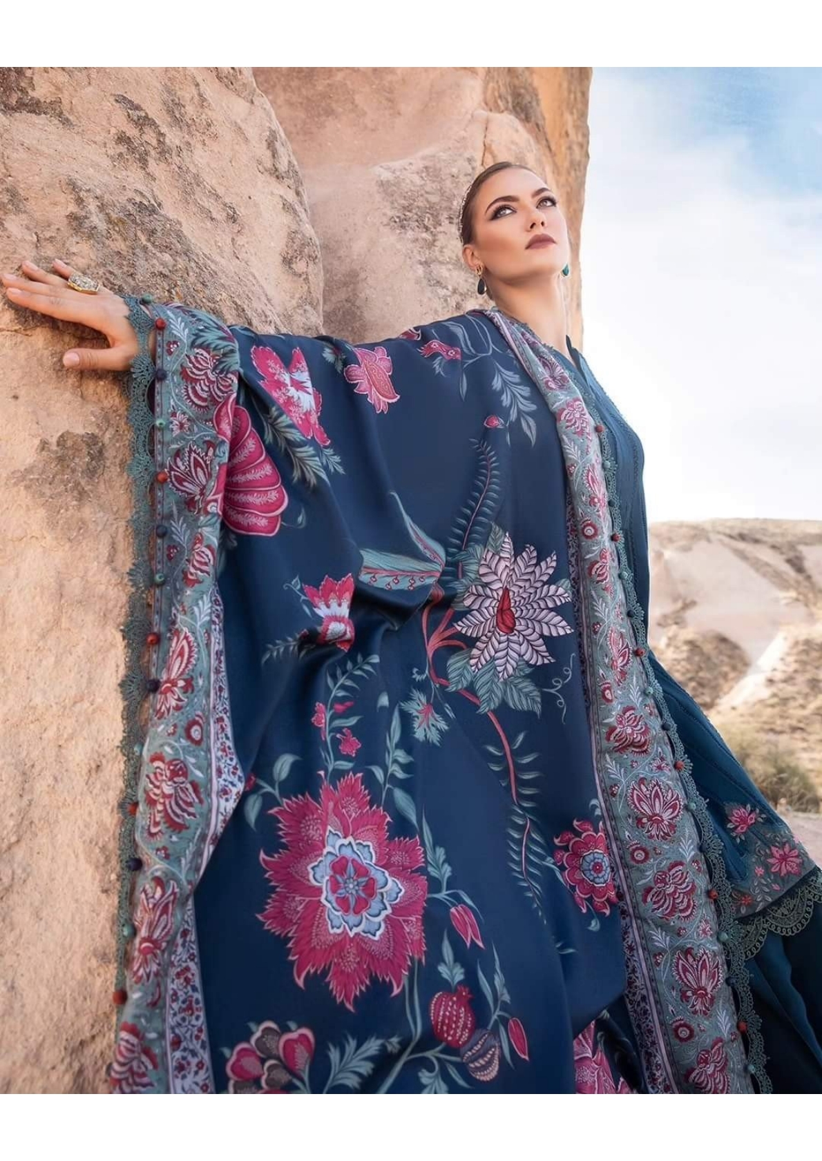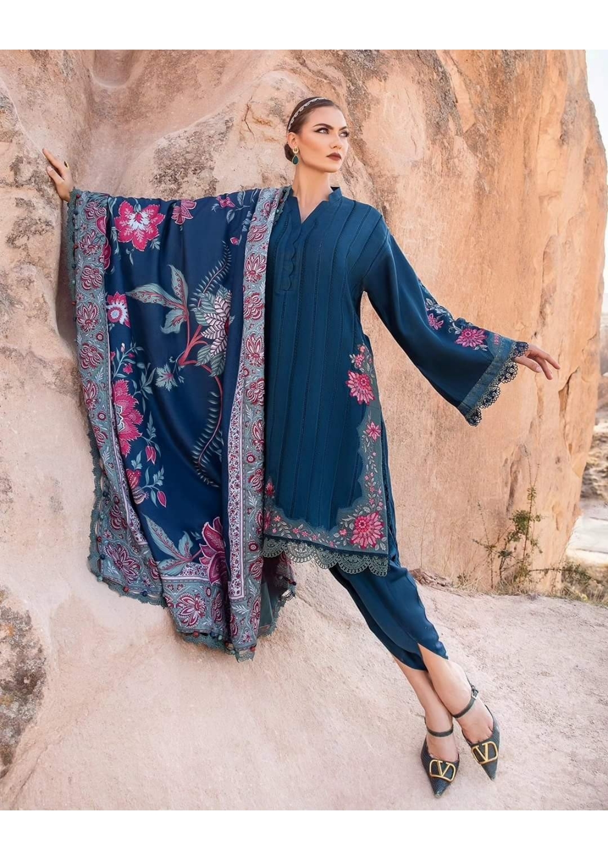 This dress features a mesmerizing blue canvas artfully illustrated with embroidery patti and patches and accompanied by printed shawl and dyed trousers, transporting you to a world of timeless elegance and grace.