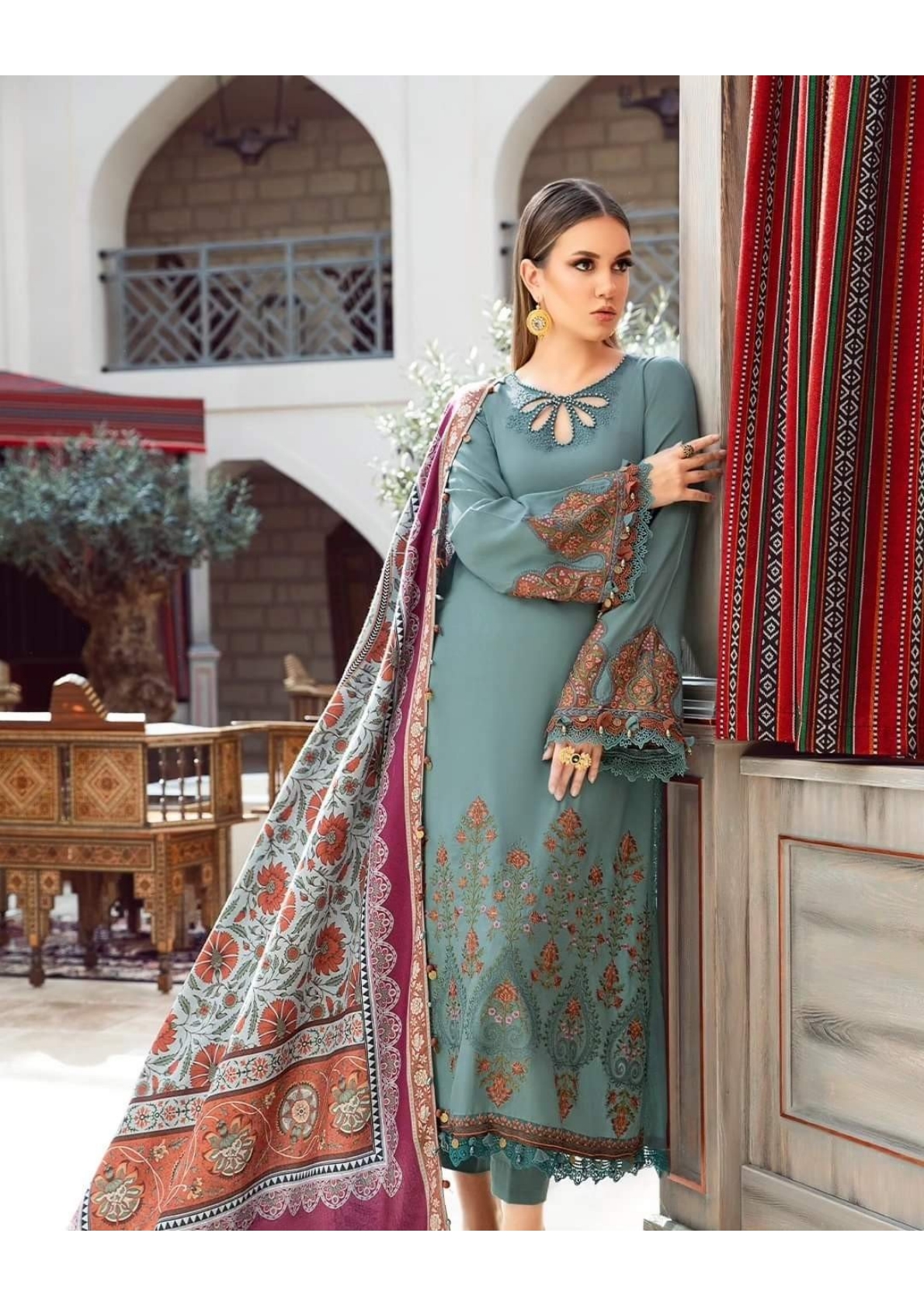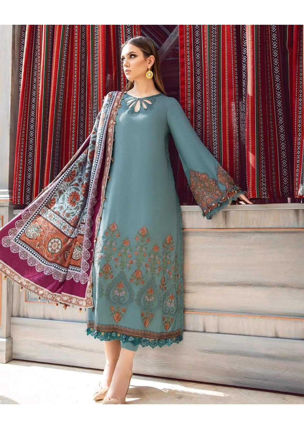 This dress is a fine artistry of refinement; featuring meticulous embroidery that seamlessly blend into grey blue canvas and paired with printed shawl and dyed trousers for ultimate style statement.