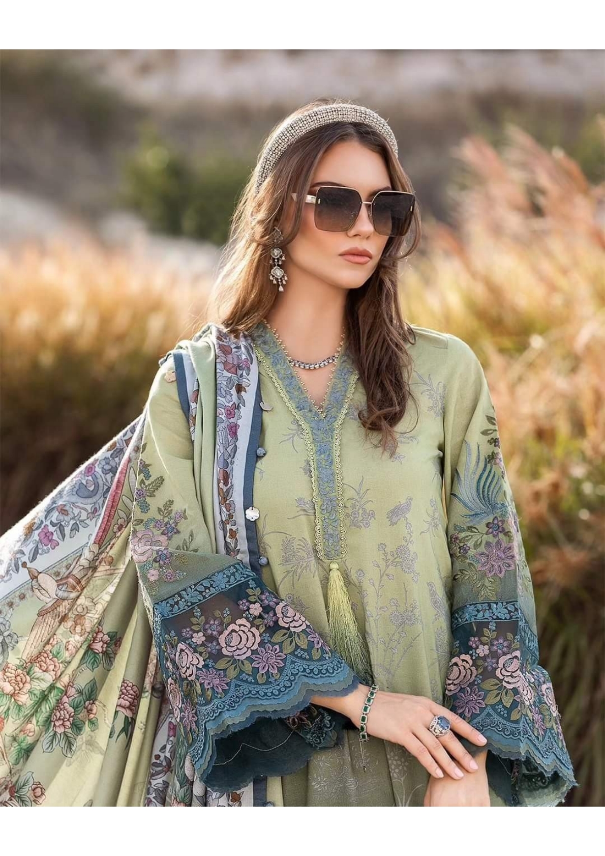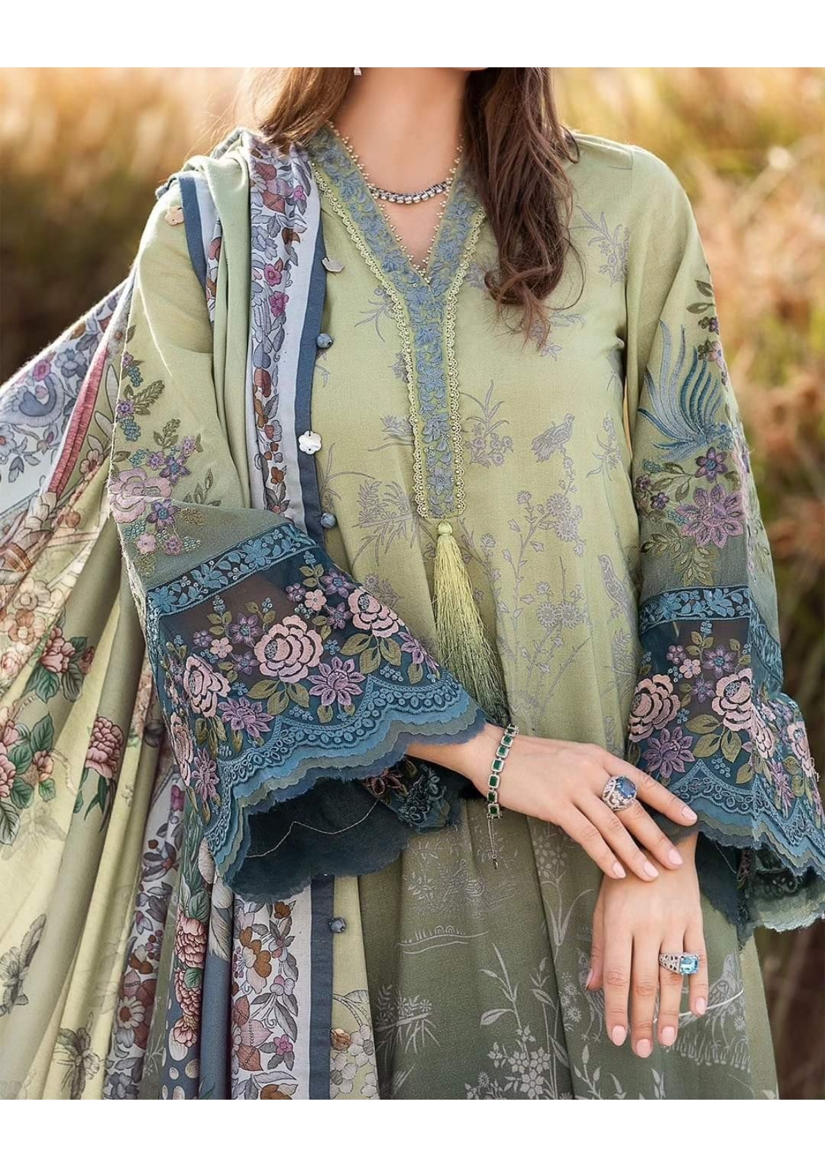 The ethereal printed canvas that unfolds in delicate light green palette framed with embroidery patch and paired with painted shawl and dyed trousers to evoke a dreamlike aura.