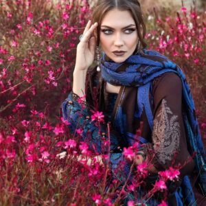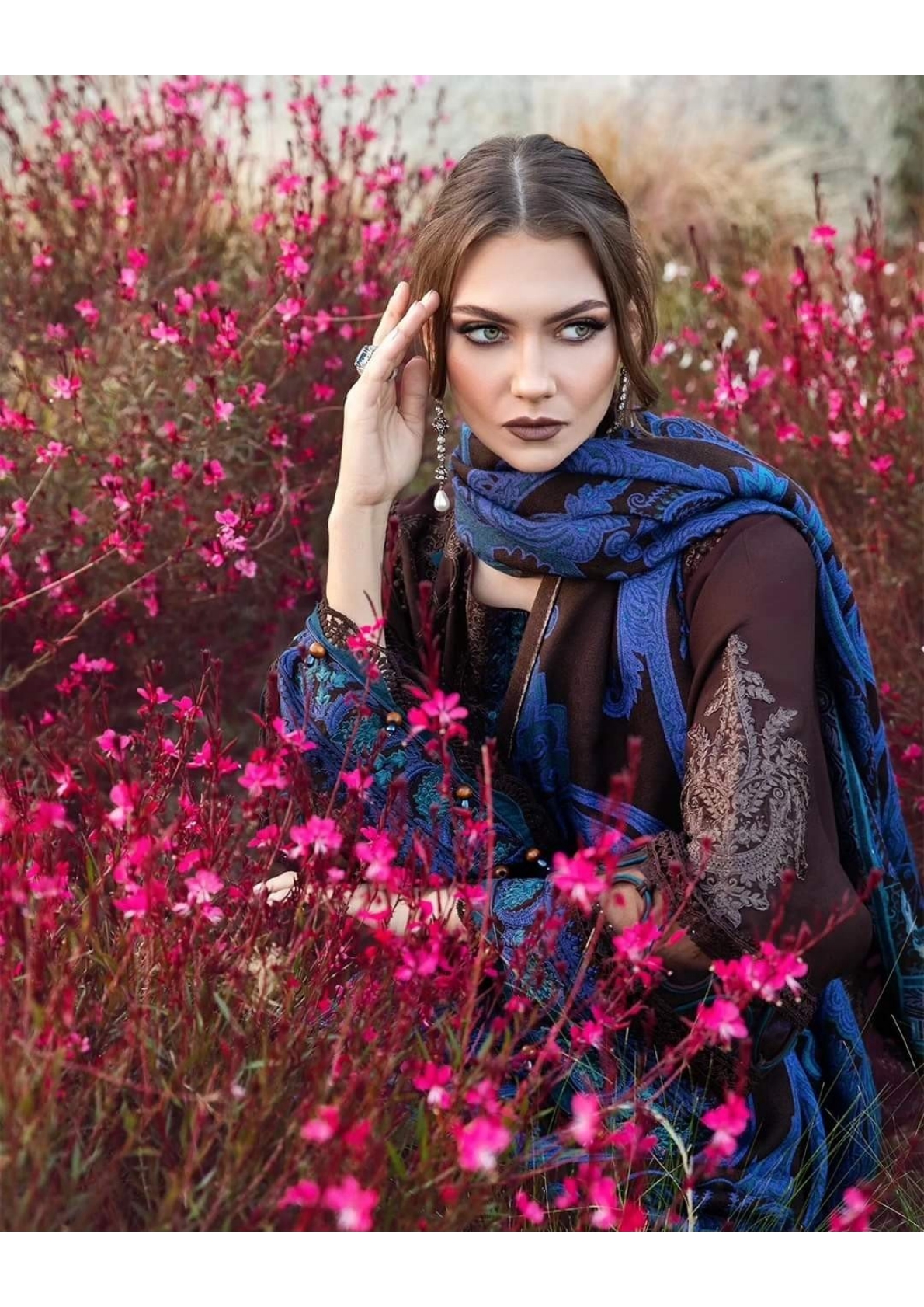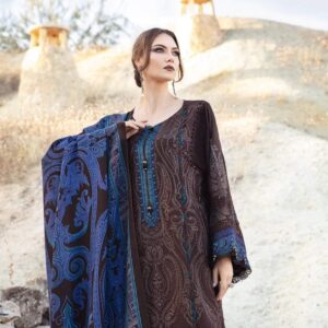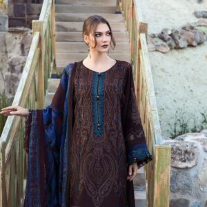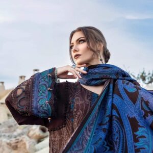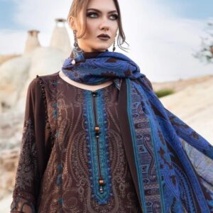 This dress is a craftsmanship of sheer elegance; with its captivating embroidery woven in rich smoldering brown tone and paired with wool shawl and dyed trousers offers an unforgettable look during your soirees.