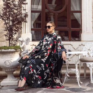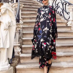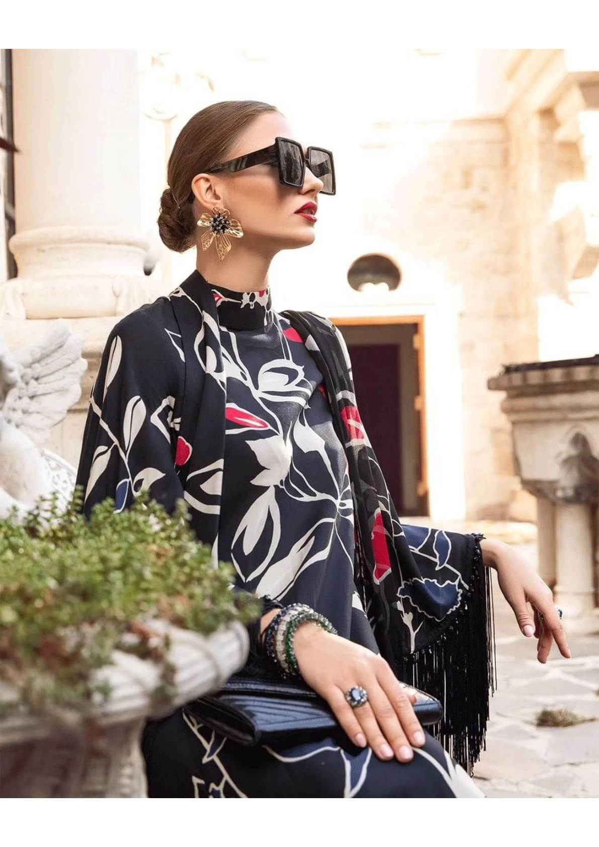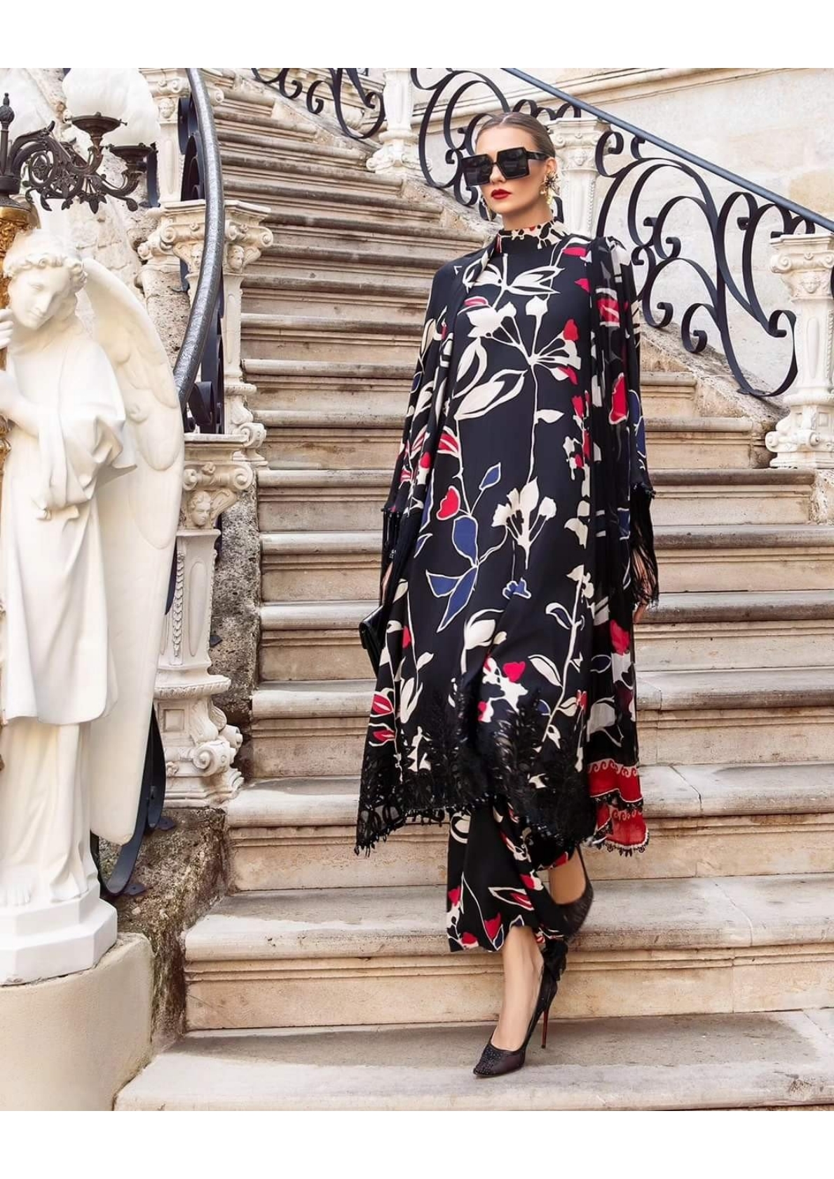 This dress is an emblem of luxury; featuring printed shirt paired with printed chiffon dupatta and dyed trousers rendered in black hue that seamlessly transition from day to night look.