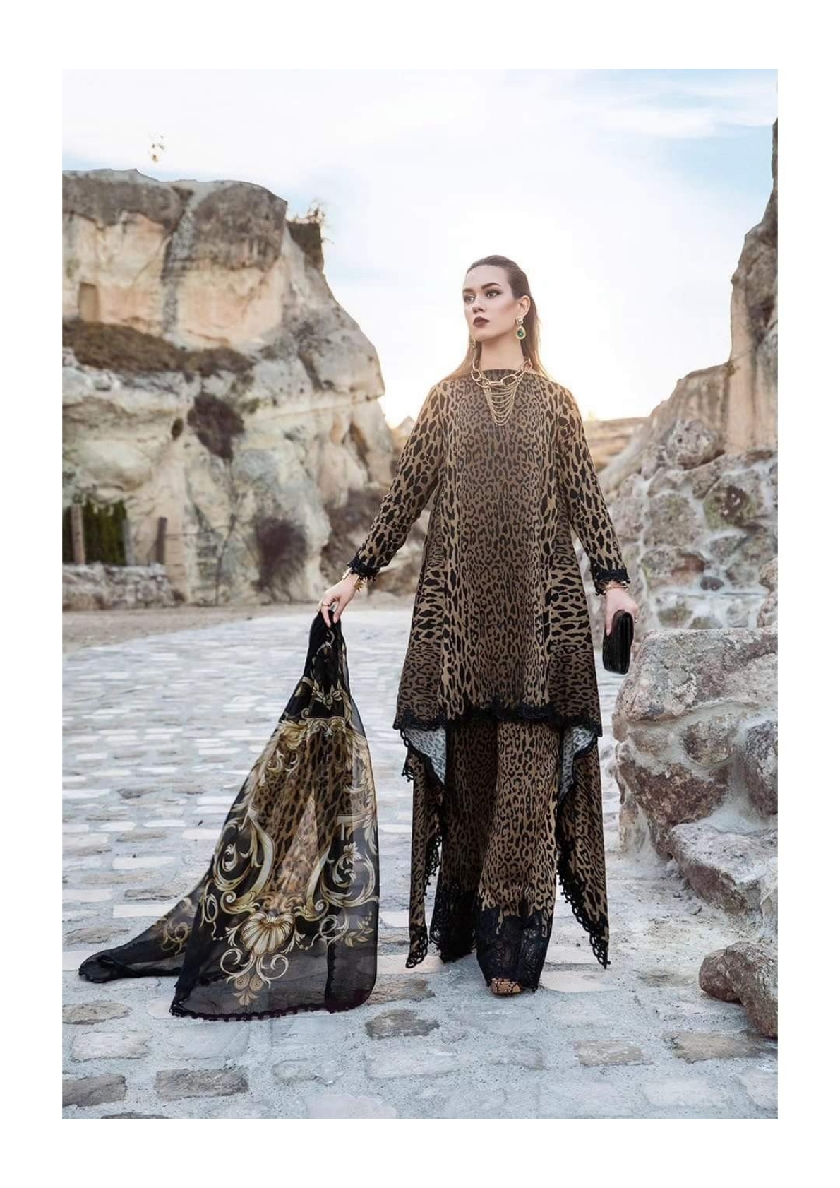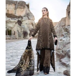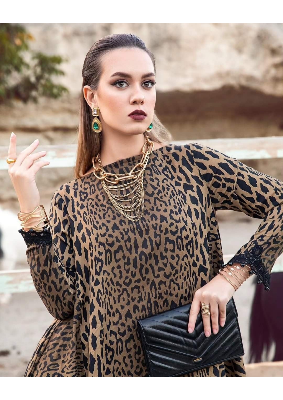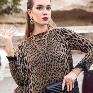 This dress is a metaphor of grace; featuring sumptuous brown printed canvas adorned with mesmerizing embroidered patti and paired with printed dupatta and trousers to keep you stylish throughout your soirees.